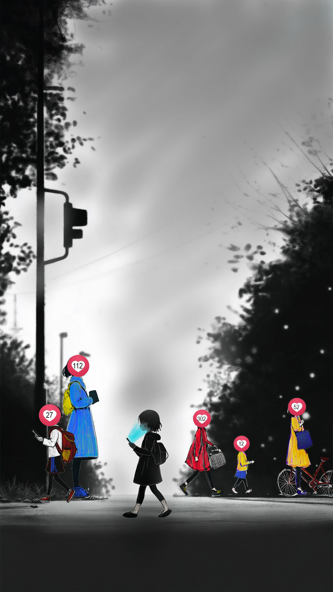 Je to metafora toho, ako cez obrazovku idealizujeme cudzí život a ten vlastný vnímame sivší, menej hodnotný.